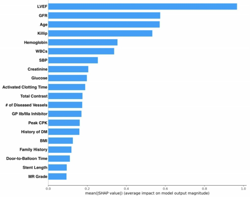 为解决这些临床痛点,由Afek Kodesh和Leor Perl领衔的国际团队开展了一项创新研究。他们收集了以色列Rabin医学中心和意大利Turin医院2004-2020年间3340例STEMI患者的全景数据,包括人口统计学指标、实验室检查、影像学参数等42项特征。研究采用CatBoost梯度提升算法构建预测模型,这种机器学习技术能自动处理缺失值,并通过500轮迭代训练优化决策树性能。特别值得注意的是,团队引入SHAP(Shapley Additive exPlanations)可解释性分析,使"黑箱"算法变得透明可视。