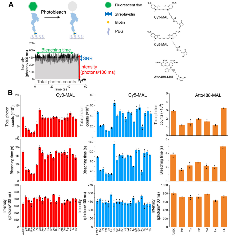 研究团队选择大肠杆菌延伸因子G(EF-G)作为模型蛋白,通过位点特异性突变在其209位半胱氨酸(Cys209)上偶联Cy3、Cy5和Atto488等荧光团。他们创造性地采用单分子全内反射荧光(TIRF)显微镜技术,配合分子动力学(MD)模拟,系统解析了不同氨基酸残基对荧光团光稳定性的调控规律。
