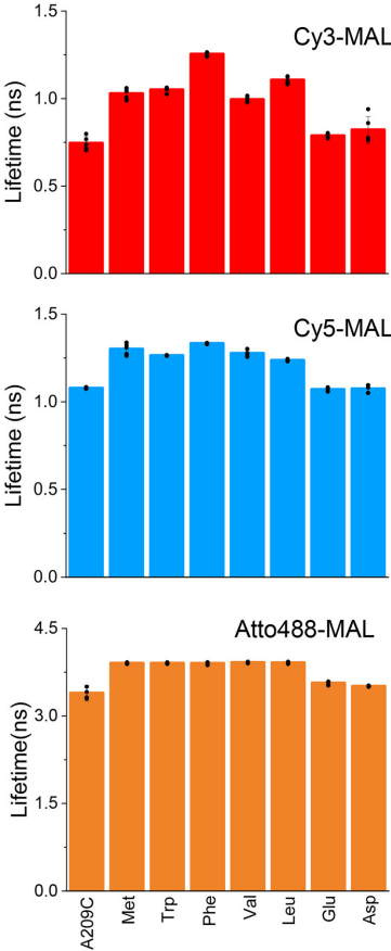 荧光寿命测量揭示出反常现象:降低光稳定性的Met/Trp/Phe反而使Cy3寿命从0.74 ns延长至1.25 ns,而提高稳定性的Glu仅轻微增加至0.79 ns。这表明传统静态/动态淬灭机制不能解释该现象,可能是延长激发态时间增加了光化学反应概率。