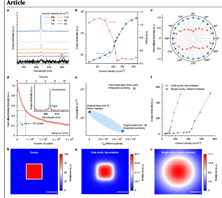 金属卤化物钙钛矿(metal halide perovskites)因其可溶液加工、高增益系数和波长可调等特性,成为激光增益介质的理想候选。尽管光学泵浦钙钛矿激光已实现室温连续运转,但电驱动激光始终面临两大瓶颈:高电流注入导致材料降解,以及传统光学腔设计与钙钛矿器件架构不兼容。现有有机电驱动激光阈值高达2.8 kA cm?2,且稳定性不足,严重制约其实际应用。