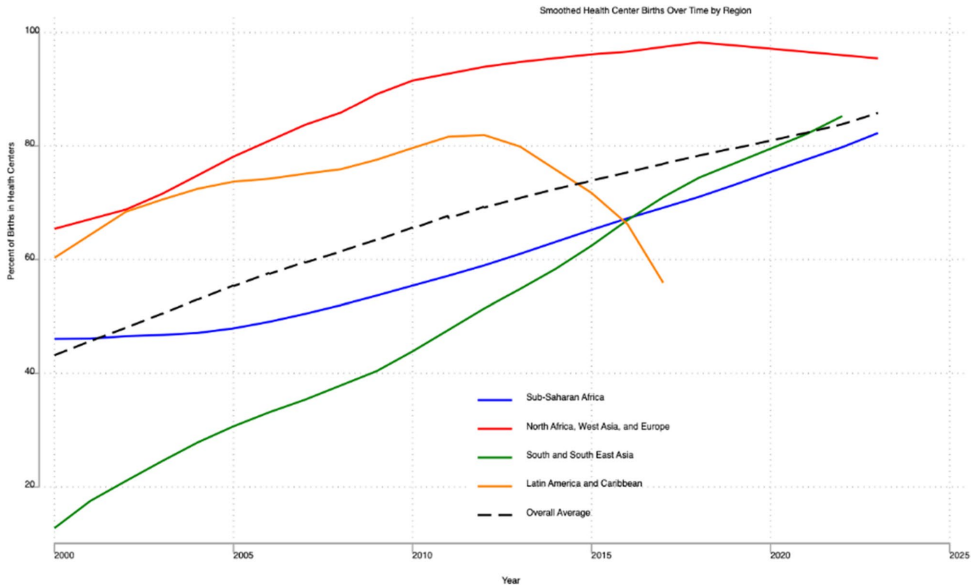 时间趋势:整体分娩率从2000年的不足50%升至2023年的80%,但南亚地区实现惊人逆袭——通过政策干预,该地区从15%飙升至85%,超越撒哈拉以南非洲。