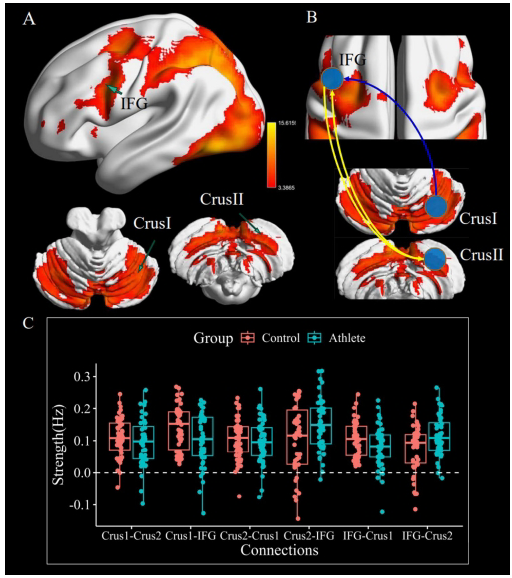 运动员右Crus I→左IFG连接减弱(p<0.029),可能减少干扰信息输入;