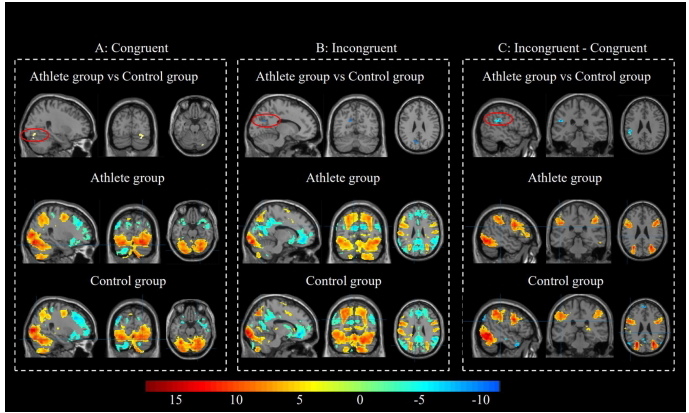 面对incongruent刺激时,运动员左楔前叶(BA31)激活增强而右额中回(BA8)激活降低,反映自动化冲突监测机制的优化;