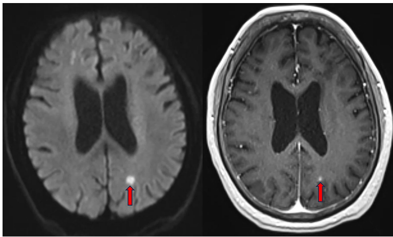 腹部增强CT显示右肝叶脓肿伴右肝静脉分支脓栓形成,红色圈注区域清晰显示直径>5cm的液化坏死灶。胸部CT呈现双肺多发性斑片状实变影,符合血行播散性肺炎特征。值得注意的是,在初始碳青霉烯类抗生素治疗10天后,患者出现神经系统症状,脑MRI在双侧额顶枕叶及小脑半球检出多发强化病灶,扩散加权成像(DWI)序列左枕叶高信号区提示化脓性脑炎。