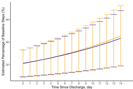 RPM组在术后14天显示出6%的显著更高恢复率(p=0.036),斜率分析表明干预组恢复速度更快。虽然未达到预设的14%临床重要差异,但步数变化趋势具有统计学意义。