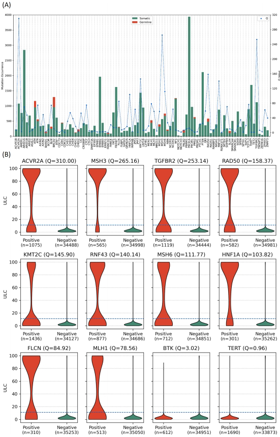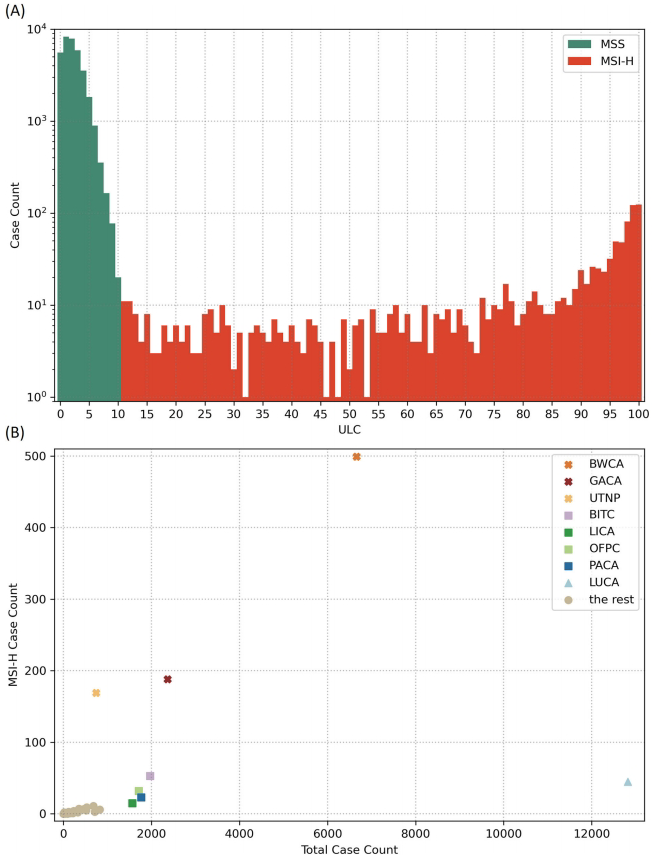 ULC分布呈现显著双峰模式(图1A),11为最佳分界值。中国人群MSI-H总体发生率低于欧洲队列,但在子宫内膜癌(UTNP)、胃癌(GACA)和肠癌(BWCA)中聚集明显(图1B),三者贡献80%的MSI-H病例。值得注意的是,胆道癌(BITC)、肝癌(LICA)等传统低发癌种也检测到相当比例的MSI-H。