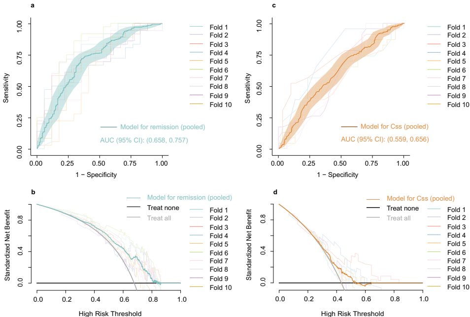 通过LASSO回归筛选预测因子,治疗缓解模型纳入基线HAMD-17评分、年龄、性别和Css(是否在TRR内),交叉验证显示AUC达0.707。值得注意的是,Css在TRR内的患者缓解率显著更高(OR=1.655)。Css预测模型则确认CYP2D6 AS的核心作用(AUC提升0.042),较低AS患者更易维持TRR内浓度(OR=0.638)。