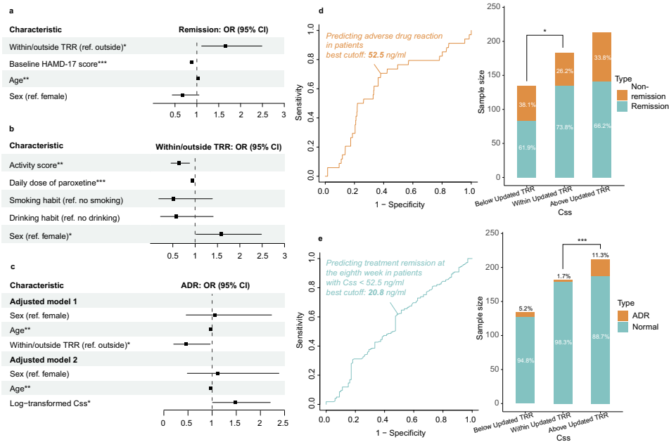 本研究针对抑郁症患者帕罗西汀治疗中疗效预测困难、个体差异大等问题,通过530例汉族人群的前瞻性队列研究,构建了治疗缓解率(AUC=0.707)和稳态血药浓度(Css)预测模型(AUC=0.615),证实CYP2D6活性评分(AS)对Css的预测价值,验证了20-65 ng/ml的治疗参考范围(TRR)在汉族人群的适用性,并整合疗效与不良反应(ADRs)数据更新TRR至20.8-52.5 ng/ml,为抑郁症精准用药提供重要依据。