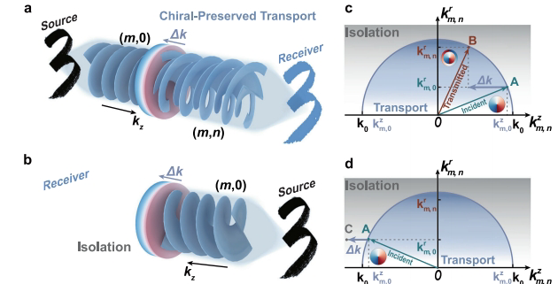 为解决这一难题,Quansen Wang、Chun Liu等团队在《Nature Communications》发表研究,提出基于径向模式自由度的创新解决方案。研究人员设计了一种轴向对称的超材料结构,通过引入外部波矢Δk驱动径向模式演化:正向传播时,入射的(m,0)模式涡旋转化为(m,1)模式,保持TC不变;反向传播时则因波矢失配使涡旋进入倏逝态。这种机制既实现了极端非对称传输(正向透射率100%,反向隔离度800倍),又完美保留了信息载体的手性特征。