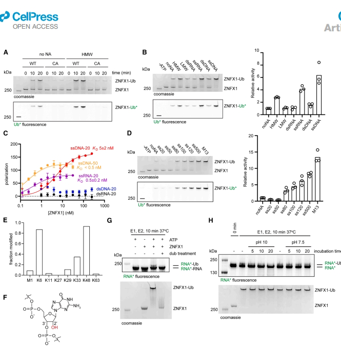 实验证明ZNFX1能特异性结合单链核酸(ssNA),但对双链形式无反应。有趣的是,只有长度超过80nt的ssNA才能有效激活其E3活性,短于50nt的ssNA虽能结合却无法激活。质谱分析证实ZNFX1主要形成K63连接的泛素链,更重要的是,它还能直接将泛素转移到RNA的2'-羟基上,这种修饰在碱性条件下可被水解,证实是通过酯键连接。