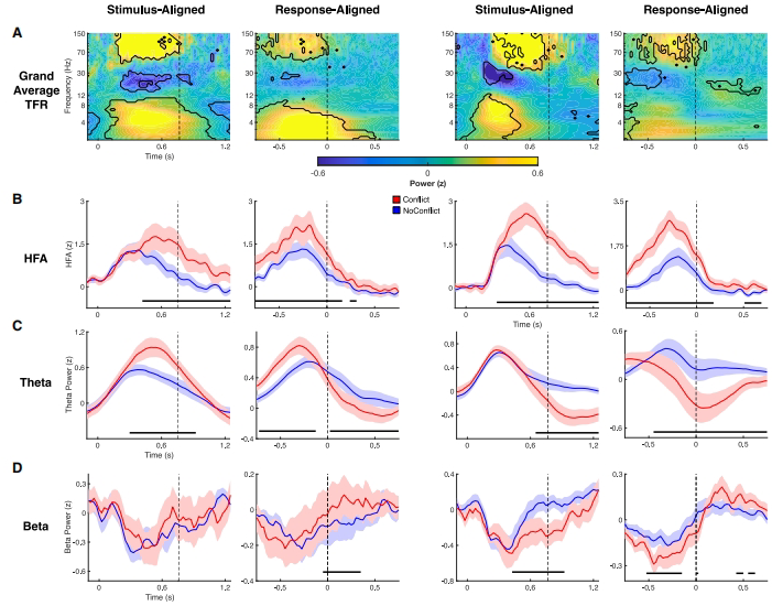 冲突试次引发dmPFC早期θ增强(刺激后300ms)和dlPFC的HFA增加(290ms),随后是dmPFC的HFA升高(420ms)。特别值得注意的是,冲突导致dlPFC出现显著的β波去同步化,而两区域在反应后都表现出θ抑制和β反弹增强。