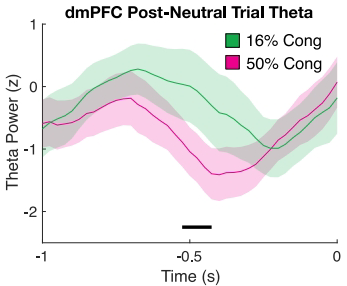 最具突破性的发现是:在冲突预期强的区块,dmPFC在试次前约500ms就出现θ活动增强。这种"预激活"现象可能是主动控制的神经标志物。