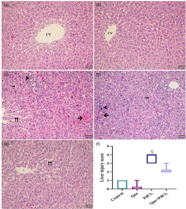 为破解这一科学问题,研究人员设计了一项系统的动物实验。他们选用24只雄性Wistar大鼠,分为对照组、Que单独处理组(30 mg/kg)、PdCl2暴露组(8 mg/kg)及Que+PdCl2联合处理组,通过28天灌胃给药建立亚急性毒性模型。研究团队采用多组学联用策略:通过全自动血液分析仪检测血常规参数,用比色法测定血清肝功能(ALT/AST)和肾功能(尿素/肌酐)指标;采用ELISA检测肝肾组织中炎症因子(IL-1β/IL-6)和DNA损伤标志物8-OHdG;借助qRT-PCR分析Nrf2、caspase-3等基因表达;结合HSP70/CHOP等蛋白的免疫组化定位以及H&E染色病理评估,全面解析毒性机制与干预效果。