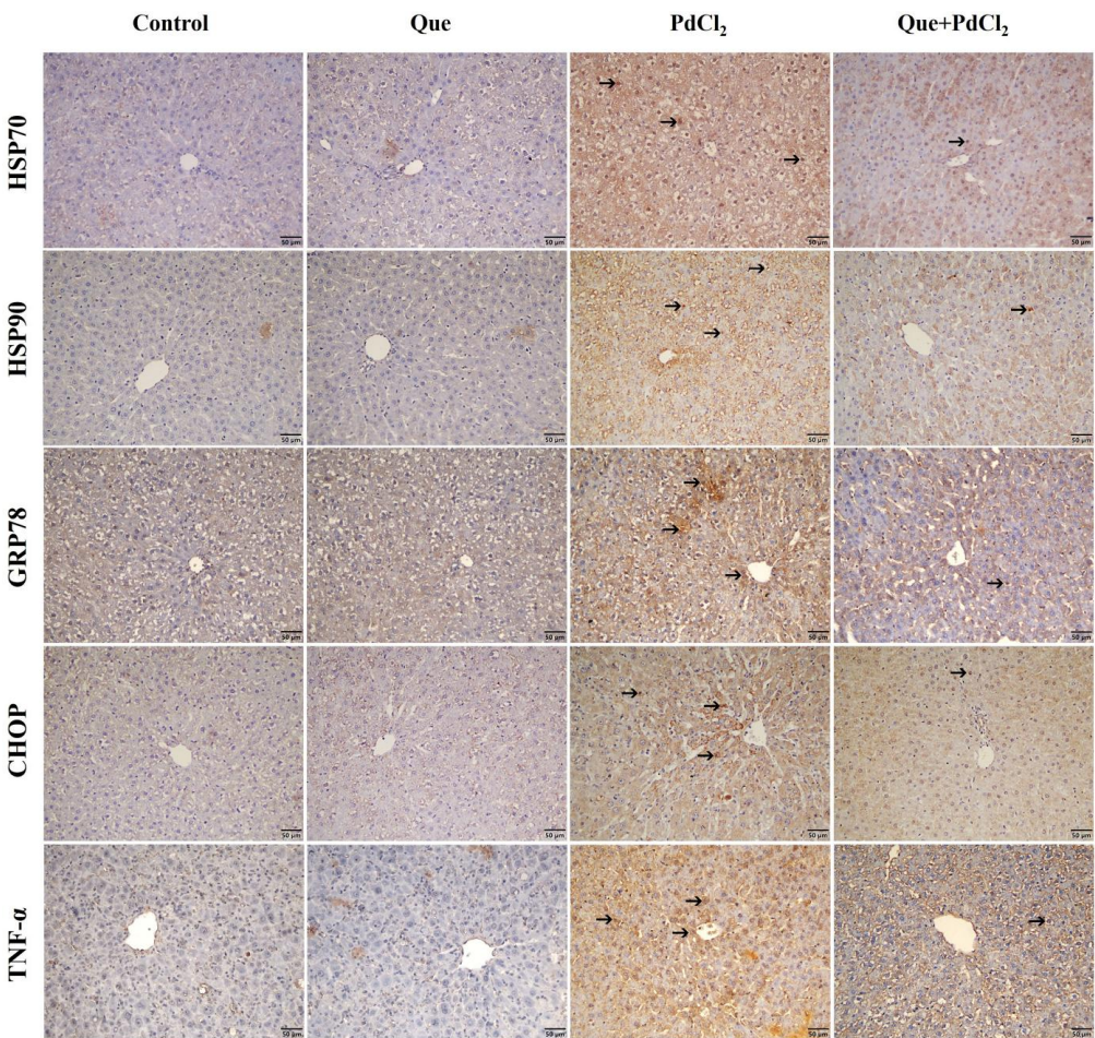 免疫组化结果显示,PdCl2使肝脏HSP70和GRP78(内质网应激标志蛋白)表达量增加3-4倍,