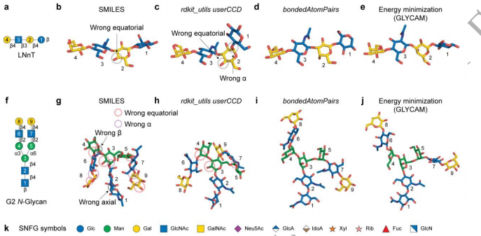 美国乔治亚大学的Chin Huang、Natarajan Kannan和Kelley W. Moremen团队在《Glycobiology》发表的研究,系统探索了AF3在糖链建模中的潜力。研究人员发现,直接使用简化分子线性输入规范(SMILES)或用户自定义化学组分词典(userCCD)会导致糖链立体化学错误,如半乳糖(Gal)C2羟基轴向/赤道取向错误、糖苷键α/β构型误判等。通过创新性地采用化学组分词典(CCD)编码的单糖模块与bondedAtomPairs(BAP)语法联用,成功构建了乳糖-N-新四糖(LNnT)、双天线N-糖链G2等复杂糖链的精确模型。