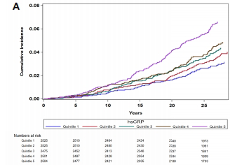 首先,改写了对"低风险"人群的认知——即使血压、血脂、血糖均达标且不吸烟,hsCRP升高者的30年心血管事件累积发生率仍达12%,远超预期。