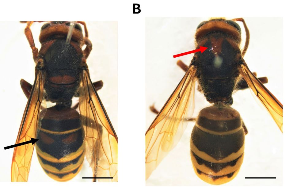 研究发现韩国种群体色呈现惊人多样性:42只符合传统V.c.crabroniformis标准(7种胸斑+2种腹纹),59只归为V.c.flavofasciata(3种胸斑+1种腹纹),而62只(38%)呈现"混合型"新模式。关键突破在于发现中胸背板与第二腹节色斑相关性仅0.22,