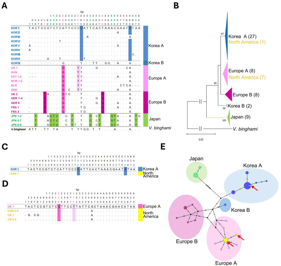 通过C292/G592等韩国特有SNP,研究者首次发现日本种群(0.023-0.028遗传距离)与韩国种群明显分化,而欧洲群体分为A(含丹麦V.c.germana)、B(含英国V.c.gribodoi)两支。北美入侵溯源显示:加拿大不列颠哥伦比亚标本与韩国KOR I完全匹配,