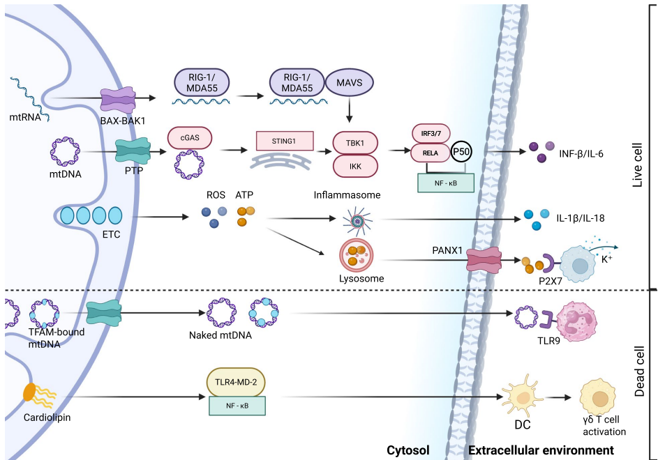 线粒体源性:线粒体DNA(mtDNA)通过TLR9和NLRP3炎症小体激活免疫反应,而线粒体双链RNA(mt-dsRNA)通过RIG-I/MDA5通路诱导抗病毒样反应。