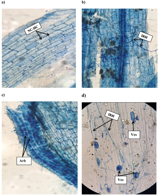 研究采用盆栽实验设计,设置6种处理组合:正常灌溉(90%WHC)、干旱胁迫(30%WHC)、KN处理(20 mg/L叶面喷施)、AM真菌接种(Rhizophagus irregularis等4种菌株)、以及KN/AM分别与干旱的组合处理。通过显微观察菌根定殖率(HC/VC/ARC),测定生长指标(株高、生物量)、生理参数(相对含水量RWC、光合色素)、氧化应激标志物(H22、电解质渗漏EL),并分析渗透调节物质(脯氨酸、可溶性蛋白、碳水化合物)和抗氧化酶系统(SOD、CAT、POX等)活性,同时定量了土壤球囊霉素含量(EEG/TG)。