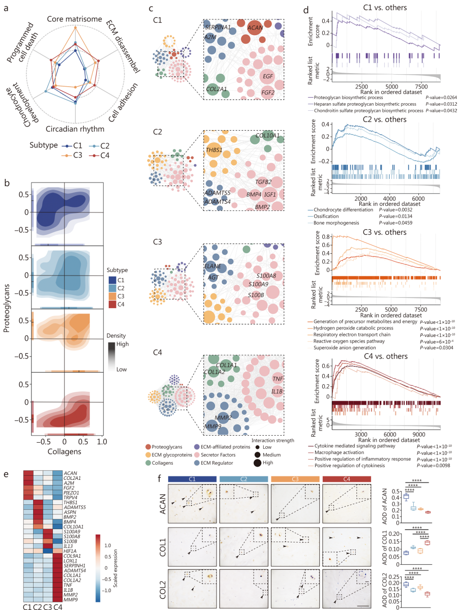 通过8000个高变基因将LDD划分为4个亚型:C1高表达机械敏感通道TRPV4/PIEZO1和胶原II(COL2A1),呈现机械应力适应性修复特征;C2富集骨形态发生蛋白(BMP2/4)和Smad通路基因,伴随椎体滑移等临床表型;C3线粒体呼吸链复合体(COX7A1/2)激活但缺氧诱导因子HIF1A下调,与老年慢性病程相关;C4显著高表达炎症因子TNF-α/IL-1β,86%样本为游离型突出。