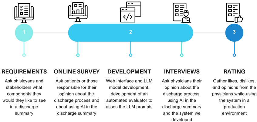 开发流程严格遵循图1所示的三阶段框架。医生们对图2所示的网络界面反响积极,该界面同步显示原始数据和AI生成的12个标准模块(包括"出院计划"、"影像检查"等),支持即时编辑。值得注意的是,73.44%患者和全部医生对AI辅助持开放态度,但10.9%患者要求过滤堕胎史等敏感信息,这促使团队采用数据最小化策略——仅向LLM传输必要医疗实体。