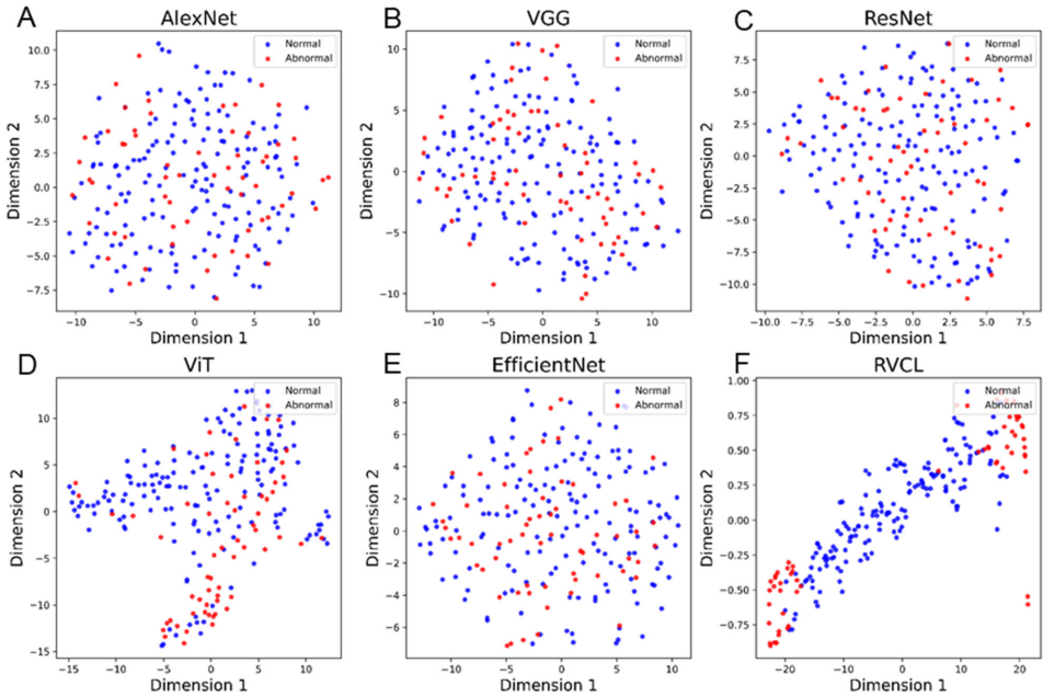 RVCL在外部测试集展现压倒性优势,其AUC(0.93)显著高于最优基线模型EfficientNet(0.72)和放射组学支持的SVM(0.59)。