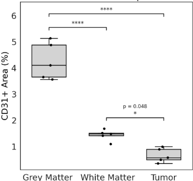 CD31染色显示肿瘤血管密度(0.66±0.27%)显著低于灰质(4.26±0.71%,p<0.00001)和白质(1.43±0.22%,p<0.05),且肿瘤血管直径普遍>10μm。
