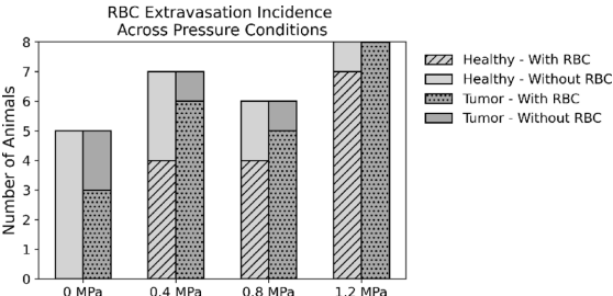 所有压力组均存在蛋白液腔和RBC外渗,但定量分析显示无统计学差异(p>0.05),且RBC面积比健康组织低一个数量级。