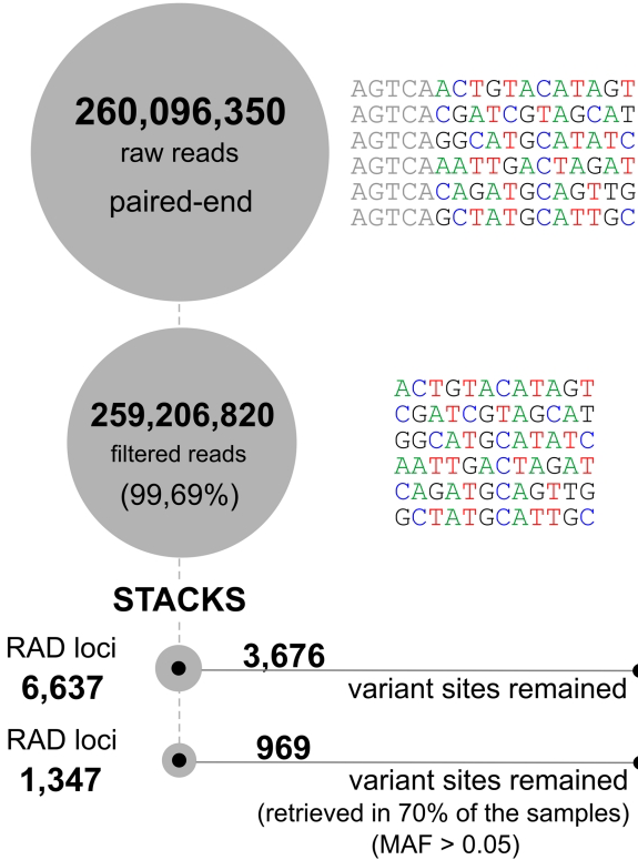 COI序列分析确认样本分类地位,但仅显示0-0.32%的种内差异。而ddRAD数据获得562个转换和407个颠换位点,其中M. pantanalense独有235个私有等位基因,显著高于M. amazonicum种群(89-107个)。