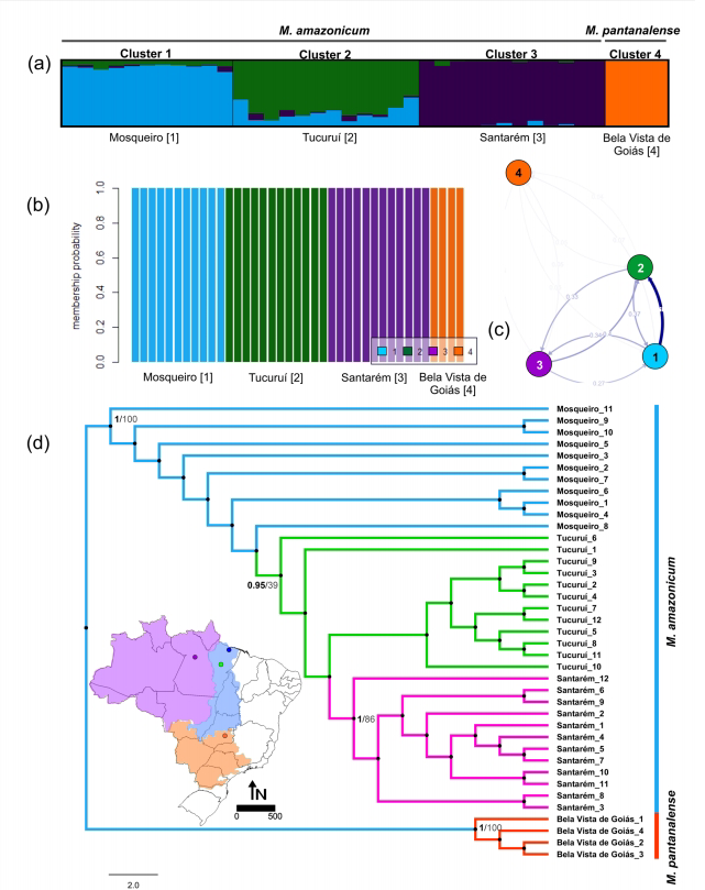 STRUCTURE和DAPC分析均支持K=4的最佳分组,对应三个M. amazonicum地理种群和一个M. pantanalense单系群。最大似然法和贝叶斯推断均以100%支持度确认M. pantanalense的独立分支地位。