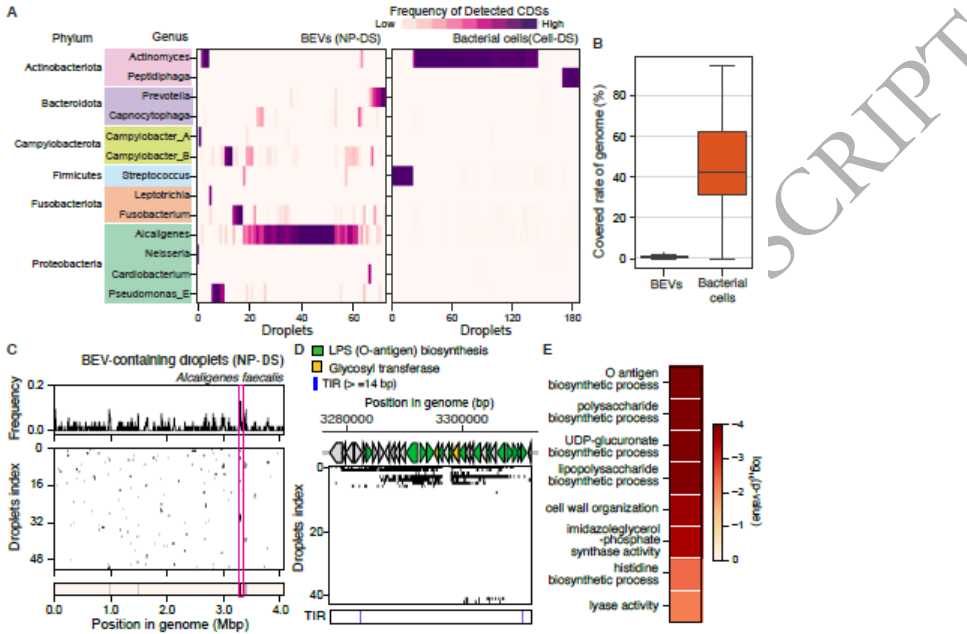 "Enriched DNA sequences in BEV-containing droplets"部分发现,粪产碱菌BEVs中LPS生物合成基因(特别是O-抗原合成基因)显著富集,这些基因与宿主-细菌互作密切相关。生物信息学分析进一步确认这些区域也存在特征性反向重复序列。