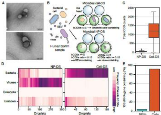 研究人员创新性地将微滴式单细胞测序技术改造为单囊泡测序(NP-DS),通过对牙龈卟啉单胞菌和牙菌斑样本中数百个BEVs的DNA分析,结合qPCR验证、透射电镜观察、纳米颗粒追踪等技术,系统研究了BEVs中DNA的组成特征和富集机制。