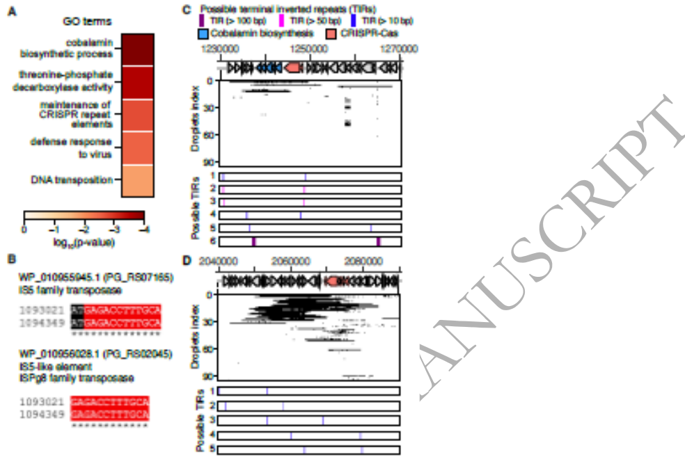 "Functional enrichment of genes in P. gingivalis BEVs"部分显示,BEVs显著富集与基因组重组相关的基因:20%的富集CDSs属于转座酶、位点特异性整合酶和CRISPR-Cas系统。特别值得注意的是,一个完整的VI-B2型CRISPR-Cas基因簇与钴胺素生物合成基因簇相邻,且两侧存在长达600 bp的反向重复序列。