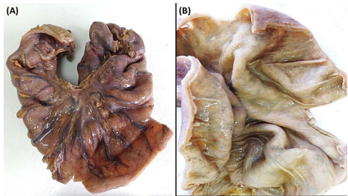 术中发现乙状结肠冗长(Dolichosigmoid)伴肠系膜轴扭转,这种解剖变异可能是年轻患者发病的结构基础。手术标本重达491g,肉眼可见黏膜充血、水肿及出血点。