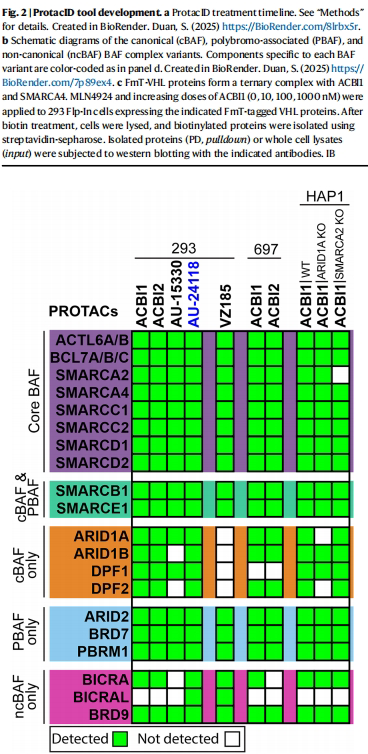 针对靶向不同BAF亚型的PROTAC(如PBAF特异性PROTAC VZI85),ProtacID仅检测到BRD7/9等亚型特异性组分,而cBAF特有蛋白ARID1A/B未被捕获(图3),证明其分辨相近蛋白复合物的能力。