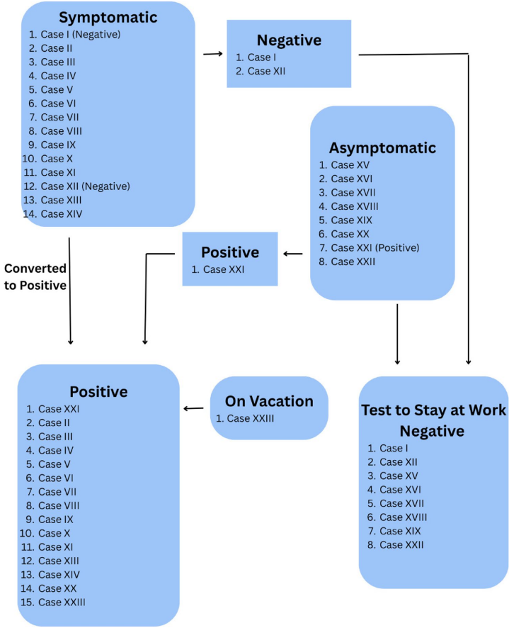 研究团队采用多维度监测方法:1)通过定制化Microsoft Teams网络应用程序收集138名HCP的结构化访谈数据;2)对两个门诊诊所进行实地考察评估环境风险;3)运用SFVAHCS专用COVID-19热线追踪系统确认传播链。所有病例均通过症状触发PCR检测确诊,暴发定义为时空关联的≥3例聚集性感染。