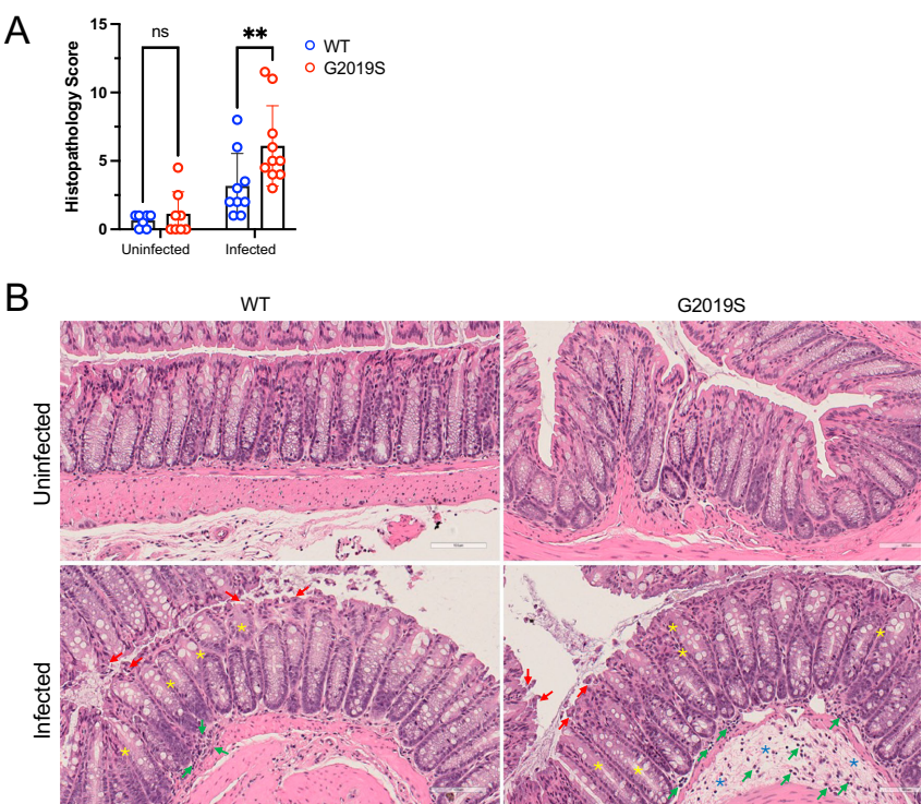 组织学评估显示G2019S感染组出现更严重的炎症浸润、隐窝结构破坏、杯状细胞丢失和水肿,病理评分显著高于WT感染组。这证实突变加剧了感染相关的组织损伤。