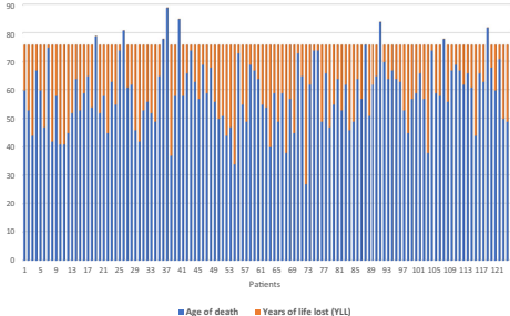 随访期间19.37%患者死亡,死亡率达21.3/1000人年,较罗马尼亚普通人群(SMR=1.58)高出58%。平均死亡年龄58.97岁,较国民平均寿命75.94岁缩短近17年。
