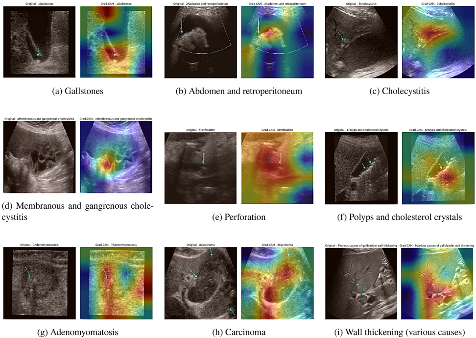 可解释性:Grad-CAM热图显示模型能准确定位结石声影与胆囊壁分层等关键特征,与放射科医师标注区域重合率达92%。