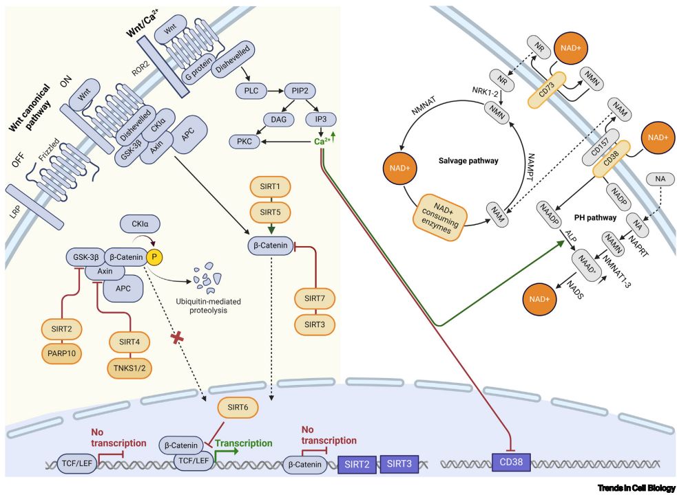 NAD+代谢与Wnt信号呈现区室化分布特征。胞质、线粒体和细胞核内的NAD+池依赖局部酶系统,而Wnt/β-catenin通路从细胞外延伸至核内。这种区室化创造了两者的交互节点: