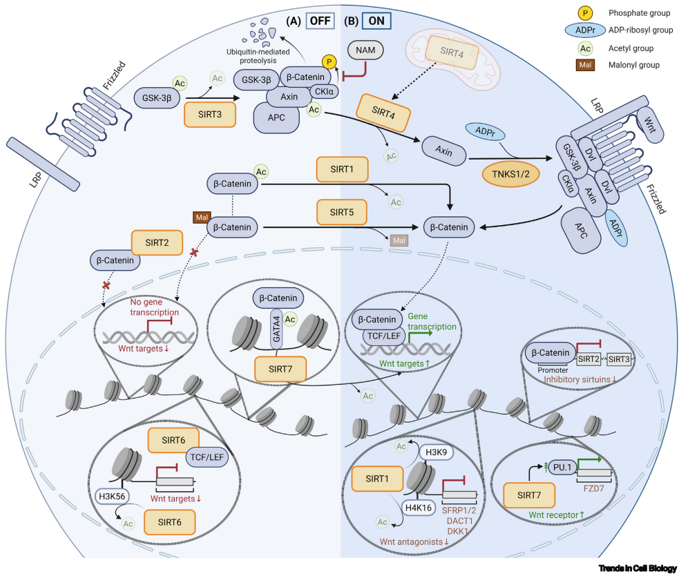 SIRT1在间充质干细胞中通过β-catenin去乙酰化促进其核转位,同时表观沉默Wnt拮抗剂DKK1/SFRP1/2