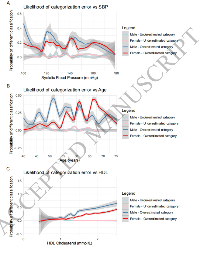 19.3%患者被图表划入更高风险类别(男性22.5%,女性17.6%)。年龄、SBP、non-HDL参数区间的下限值附近,误判概率超50%。例如,SBP 120-129 mmHg(降压目标范围)患者更易被高估风险。