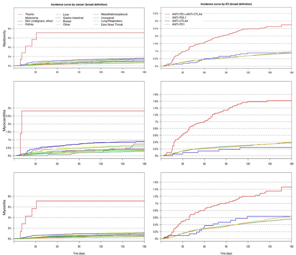 The 6-month cumulative incidence of ICI myotoxicities ranged 0.7%-0.9%, with striking variation by cancer type - from 0.5% in ENT cancers to 7.1% in thymic malignancies. Myocarditis and myositis showed substantial overlap (13%-23% co-occurrence). Multivariable analysis revealed: