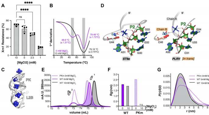 这项发表于《Nucleic Acids Research》的研究首次解析了植物病毒ST9a xrRNA的活性构象,揭示其与黄病毒xrRNA虽骨架迥异,却通过趋同进化形成相似的5'端保护环结构。研究人员结合X射线晶体学(2.9 ?分辨率)、SEC-SAXS(尺寸排阻色谱-小角X射线散射)和体内外降解实验,发现ST9a xrRNA通过9碱基对的假结(PK)形成保护环,并由镁离子"锁扣"稳定。关键突变实验证实,破坏保护环拓扑结构会完全消除Xrn1抗性,并使病毒复制减弱。生物信息学分析进一步在363种植物病毒中发现同类结构,证实该机制的广泛保守性。