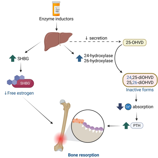 CYP450诱导型ASM(苯妥英、卡马西平、奥卡西平)加速25-羟维生素D(25-OHVD)转化为无活性24,25-二羟形式,导致继发性甲旁亢。丙戊酸(VPA)则通过独特途径损害骨骼: