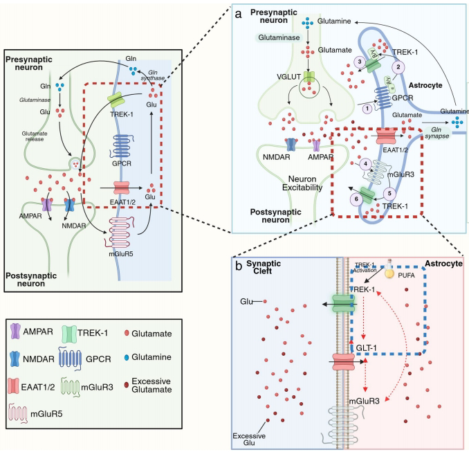 清除增强:PUFAs激活TREK-1可上调谷氨酸转运体GLT-1表达,而mGluR3持续激活也能通过GLT-1促进谷氨酸再摄取。