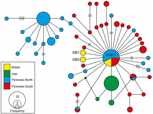 10个英国样本中鉴定出3种单倍型,其中6个体携带欧洲大陆主流单倍型EUR1,另4个体携带仅在英国发现的新单倍型GB1/GB2。单倍型网络分析显示其与法国/伊比利亚种群亲缘最近,排除了来自爱尔兰的可能性。