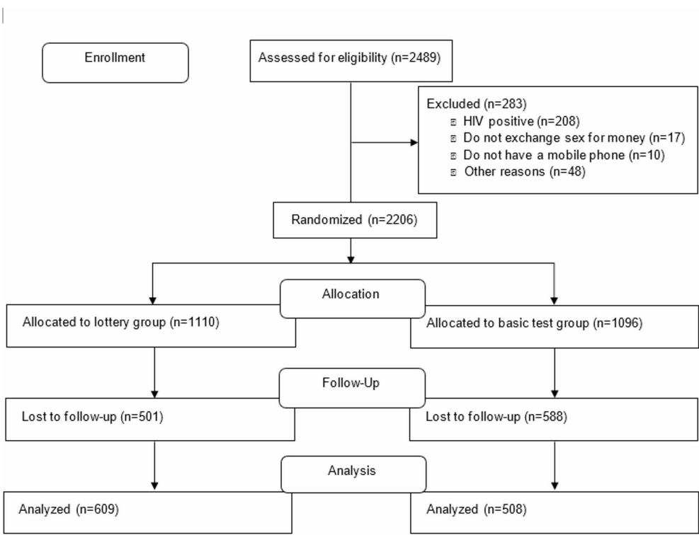 研究团队采用随机对照试验设计,在坦桑尼亚达累斯萨拉姆招募2,206名HIV阴性FSW,随机分为基础服务组(对照组)和彩票激励组(干预组)。关键技术方法包括:1)采用应答者驱动抽样(RDS)进行人群招募;2)每周随机选择10名干预组参与者进行梅毒和滴虫检测,阴性者可获得100,000坦桑尼亚先令(约50美元)奖励;3)通过指纹识别系统防止重复注册;4)使用快速检测和ELISA方法进行HIV/HSV2等生物标志物检测;5)采用线性概率模型分析干预效果。