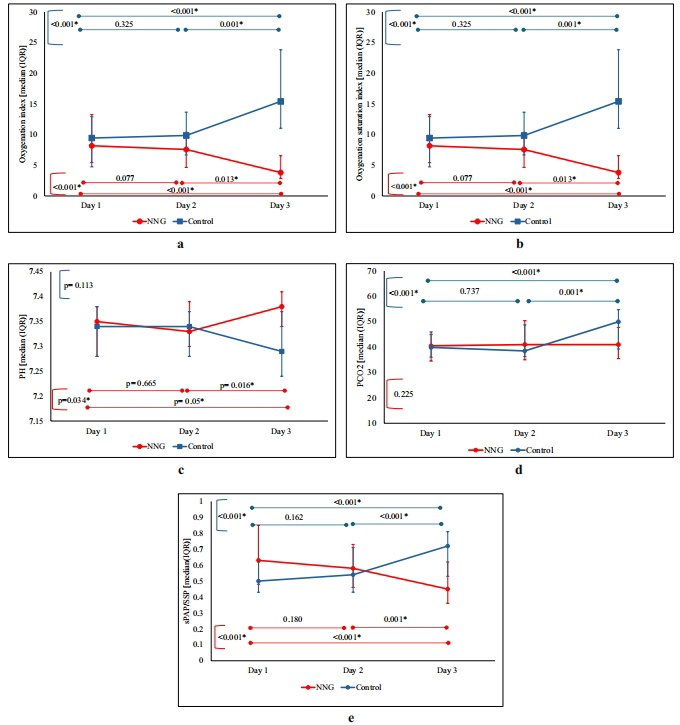 氧合改善:NNG组第2-3天OI和OSI显著优于对照组(p<0.05),pH值更高而PaCO2更低